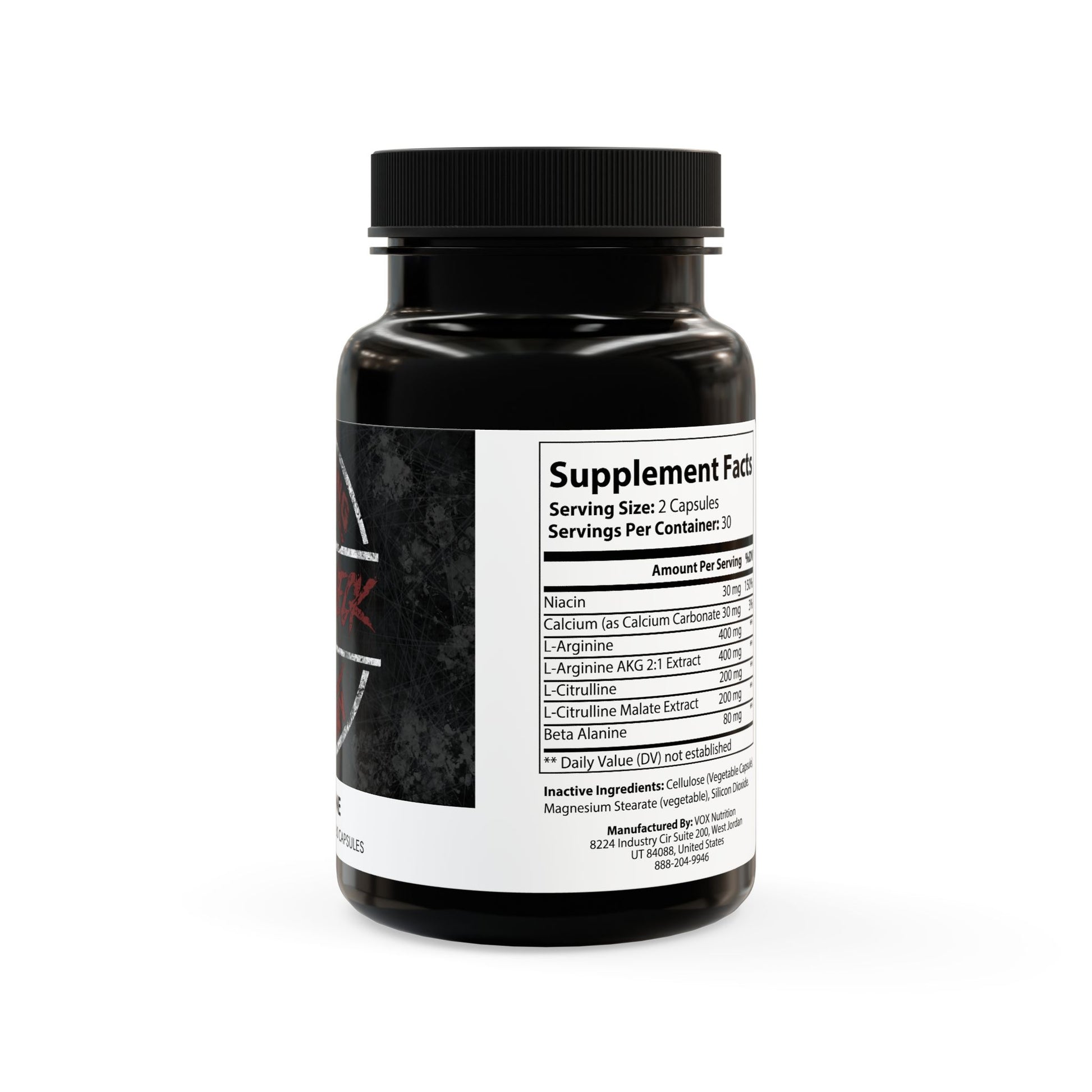Ingredients: Niacin, Calcium, L-Arginine, L-Arginine AKG 2:1 Extract, L-Citrulline, L-Citrulline Malate Extract, Beta Alanine. Inactive Ingredients: Cellulose (Vegetable Capsule), Magnesium Stearate (vegetable), Silicon Dioxide